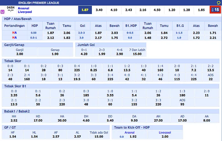 Liverpool vs Arsenal + 0.5 ( Arsenal di Voor 1/2 ) Anda pegang Liverpool dan Liverpool menang 1–0 ( menang full ) Anda pegang Liverpool dan hasil akhir pertandingan Draw ( kalah Full ) Jika anda pasang Arsenal hasil pertandingan Draw ( menang Full ) Jika anda pasang Liverpool dan hasil akhir pertandingan Liverpool kalah ( anda kalah full )